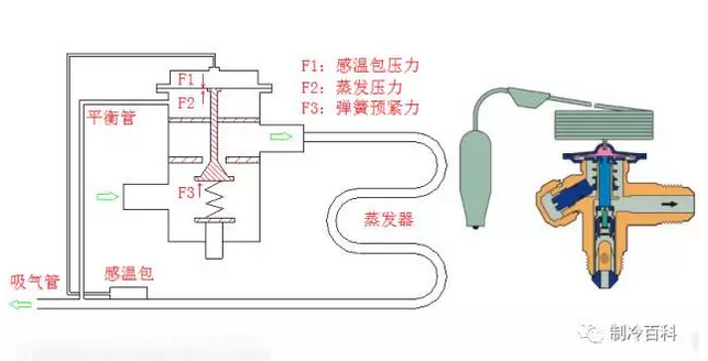 熱力膨脹閥通過感受蒸發器出口制冷劑的過熱度,從而調節蒸發器中的液體制冷劑的供給量,進而控制蒸發器的負荷,使之與系統實際負荷相匹配。