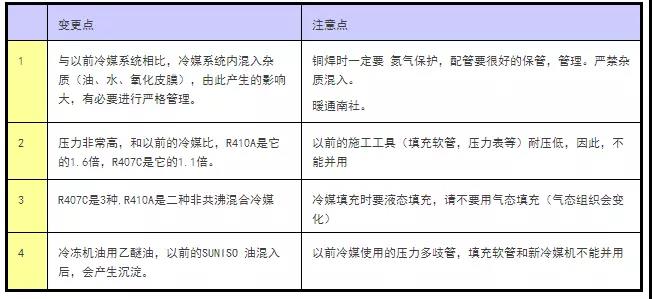 5新冷媒R407C,R410A和R22比較,有下面的注意點: