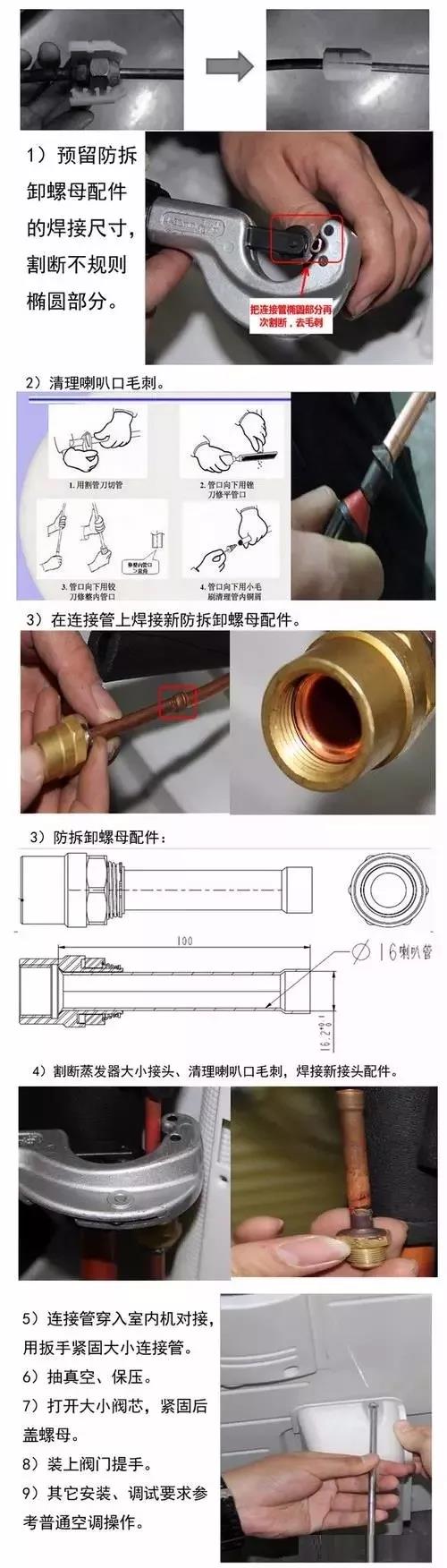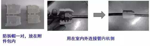 由于室內側連接管外安裝有不可拆卸的防拆帽,所以當涉及室內機系統需要返回專業網點維修時,必須破壞防拆帽,操作要求如下: