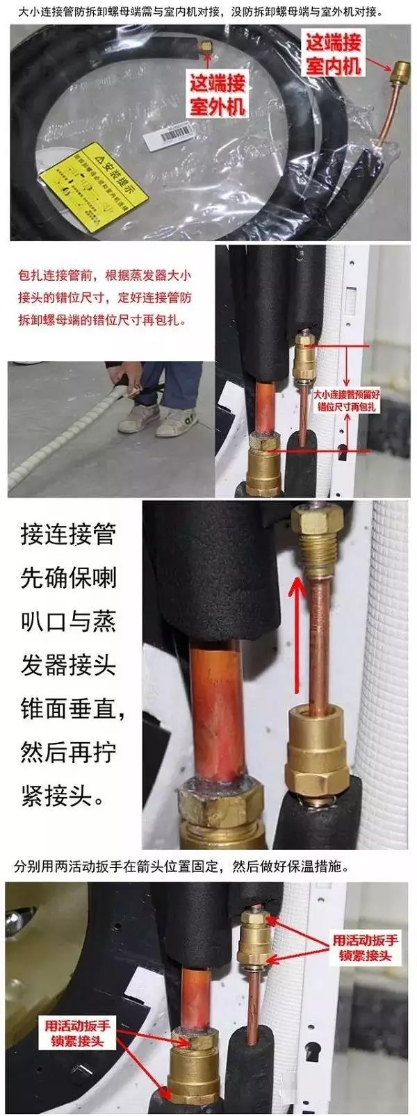 1)將連接管穿入室內機對接,用扳手緊固大小連接管。