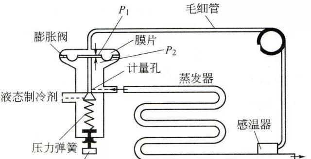 a.對高壓液態制冷劑進行節流降壓,保證冷凝器和蒸發器之間的壓力差,以使蒸發器中的液態制冷劑在要求的低壓下蒸發吸熱,從而達到制冷降溫的目的;同時使冷凝器中的氣態制冷劑,在各頂的高壓下放熱冷凝。