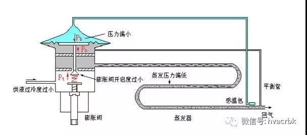 如果膨脹閥出口壓力過高,相應的蒸發壓力和溫度也過高。進入蒸發器的流量和壓力都加大,由于液體蒸發過剩,過潮氣體(甚至液體)被壓縮機吸入,引起壓縮機的濕沖程(液擊),使壓縮機不能正常工作,造成一系列工況惡劣,甚至損壞壓縮機。